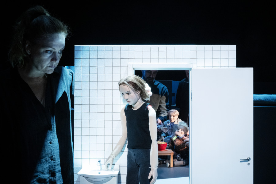 Bild vänster: Från föreställningen Oxytocin, foto Ola Kjelbye, skådespelare Malin Morgan (i bakgrunden Wahid Setihesh).
